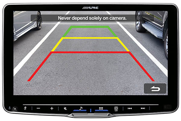 The Alpine Halo11 includes two camera inputs to add a front, side, or rearview camera (sold separately). The rearview camera includes a distance guide display that overlays guidelines onto the screen for ease when moving in reverse.