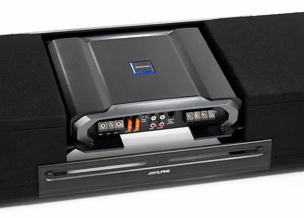 The enclosures were intentionally crafted to fit most full-size trucks. Two 8” subwoofers are preloaded into a compact enclosure for under the seat installation and linked with a ProLink™ bracket that can adjust from 51”-40”. Centered on the enclosures is an integrated amplifier mount tray that’s optimized for Alpine’s R-A75M Mono Power Amplifier (sold separately). Rubber “feet” are adjustable in height to accommodate uneven truck floors.