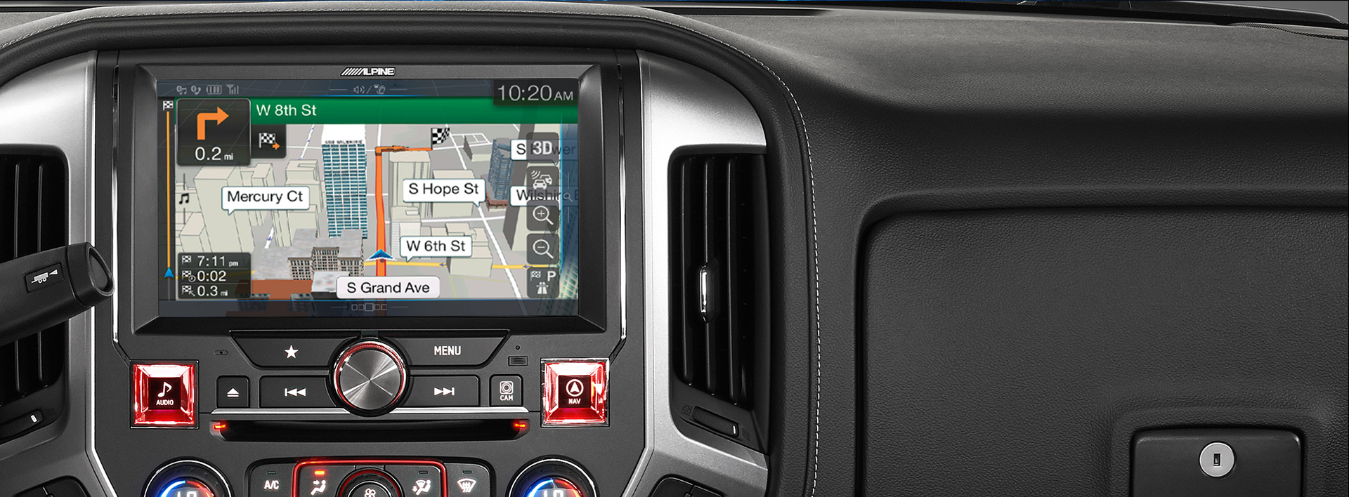 The 10-inch X110-SRA is Alpine engineered specially for the GMC Sierra. The X110-SRA comes with a stunning dash bezel that houses the 10-inch screen and provides a matching fit and finish, as if it came that way from the factory. The rotary volume knob and big crystal buttons for music and navigation sources are backlit to match the Sierra’s factory gauges. Other hard keys provide direct access to the main menu and My Favorites feature.
