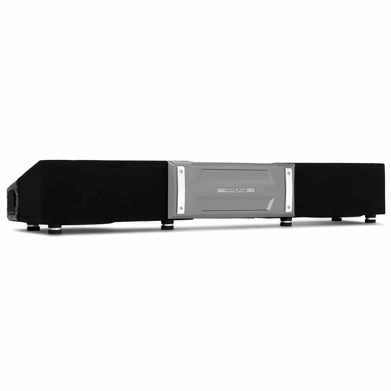 The enclosures were intentionally crafted to fit most full-size trucks. Two 8” subwoofers are preloaded into a compact enclosure for under the seat installation and linked with a ProLink™ bracket that can adjust from 51”-40”. Centered on the enclosures is an integrated amplifier mount tray that’s optimized for Alpine’s S-A60M Mono Power Amplifier (sold separately). Rubber “feet” are adjustable in height to accommodate uneven truck floors.