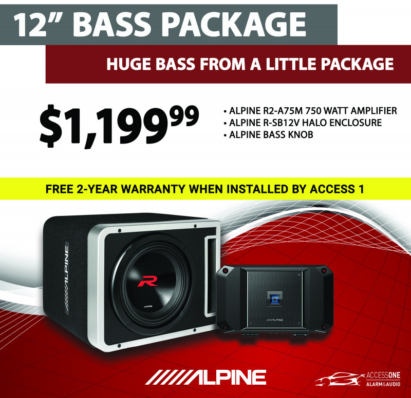 Alpine R-Series Single 12" Bass Package - Get MONSTER BASS from this 750 Watt Alpine package. Includes Amplifier, Subwoofer and Bass Knob. Have us install it and you get a FREE 2-year replacement warranty.
