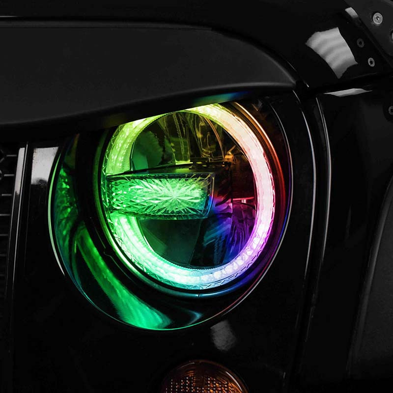 Upgrade your Jeep’s headlights to 7” Chasing LEDs. The headlights have an output of 3000 lumens for the high beam and 1900 lumens for the low beam. The durable polycarbonate lens cover makes this an ideal solution for adventurous Jeep owners. Along with the Connect Controller, these headlights offer more than 170 pre-programmed modes for patterns with 16 million different colors. The controller has two wireless control options; an included remote control or a free app for a smartphone or tablet, allowing users to change colors, sync to music, and more. This lighting set also works with our other Chasing lighting products, allowing an entire system to use the same app and remote.